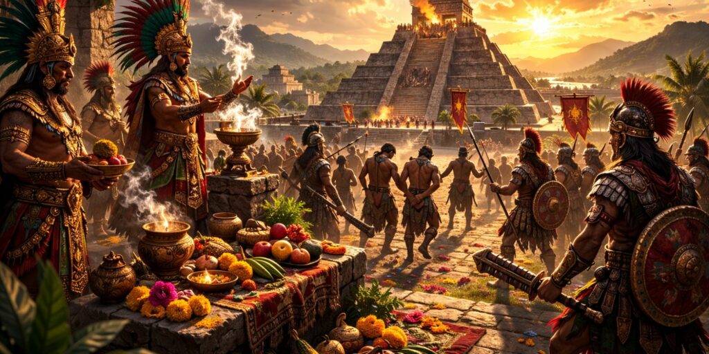 La religion aztèque reposait sur l’idée que les dieux devaient être nourris par des sacrifices humains réguliers. Sans ces offrandes, l’équilibre cosmique risquait de s’effondrer et le soleil de ne plus se lever. Les guerres fleuries fournissaient un nombre constant de prisonniers destinés aux rituels. Elles assuraient la continuité des cérémonies sacrées. La guerre devenait une nécessité spirituelle.