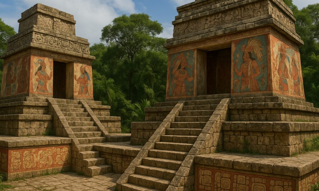 Les pyramides mayas n’étaient pas de simples blocs gris et austères : elles étaient richement décorées. Les murs des temples étaient peints de fresques colorées représentant des scènes mythologiques, des cérémonies religieuses ou des conquêtes militaires. Ces fresques racontaient l’histoire des cités et glorifiaient les rois.