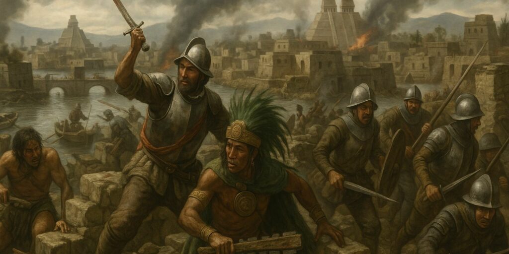 Après plusieurs mois de conflits, Cortés décide de lancer un siège total sur la capitale aztèque. Tenochtitlán, pourtant bâtie sur un lac et difficile d’accès, devient progressivement encerclée. Les Espagnols coupent les voies d’approvisionnement, détruisent les aqueducs et affament la ville. Ce siège méthodique, inédit pour les Aztèques, provoque une lente agonie de la population.