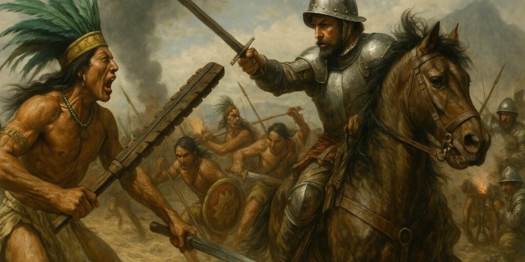 Face aux guerriers aztèques, les conquistadors disposent d’un avantage technologique indéniable. Leurs armures en métal, leurs épées d’acier, leurs arquebuses et surtout leurs chevaux sont inconnus des peuples mésoaméricains. Cette supériorité matérielle provoque la stupeur chez les Aztèques et déséquilibre rapidement les affrontements. Les armes aztèques, bien que redoutables dans les combats locaux, s’avèrent inefficaces contre les protections espagnoles.